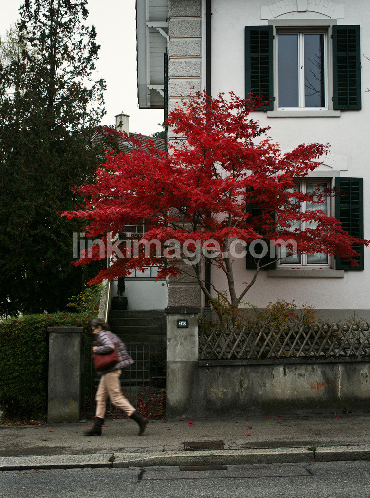 - in a hurry, color, colorful, street, drenched, go, goes, house, autumn, woman, light, leaf, red, switzerland, blurry, tree, wave, bag, zurich