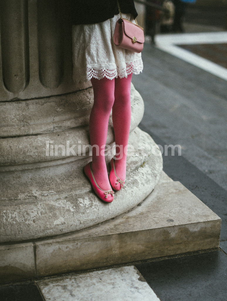 - children, childhood, bone, girl, handbag, bag, skirt, climb, light, leaning, pillar, pink, shoes, stands, teenager, bag