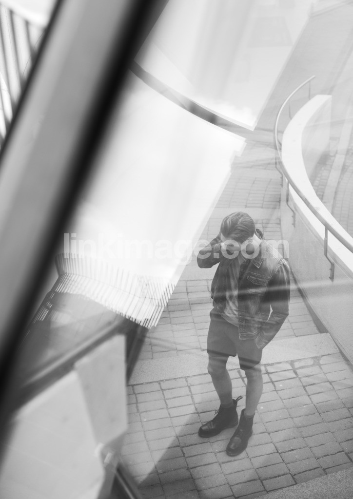 - city, man, shorts, window, street, jacket, jeans, boots, line, fashion, model, portrait, pose, shoes, reflection, style, stands, staircase, wave, waiting