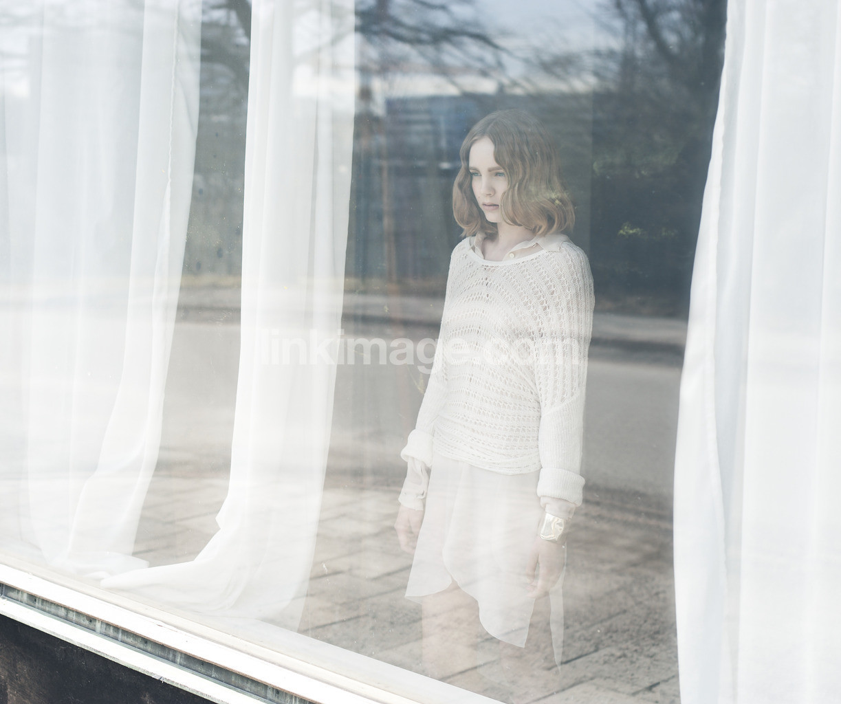 - pale, window, curtain, street, home, house, clothes, woman, light, fashion, model, portrait, pose, knitwear, style, swedish, girl, troy, white, waiting