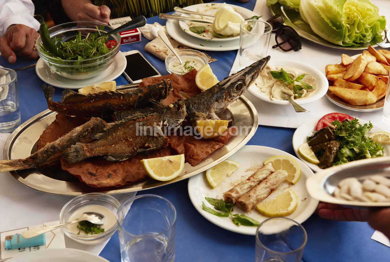- table, lemon, ducat, fish, lunch, restaurant, summer, company, together, intercourse, eat