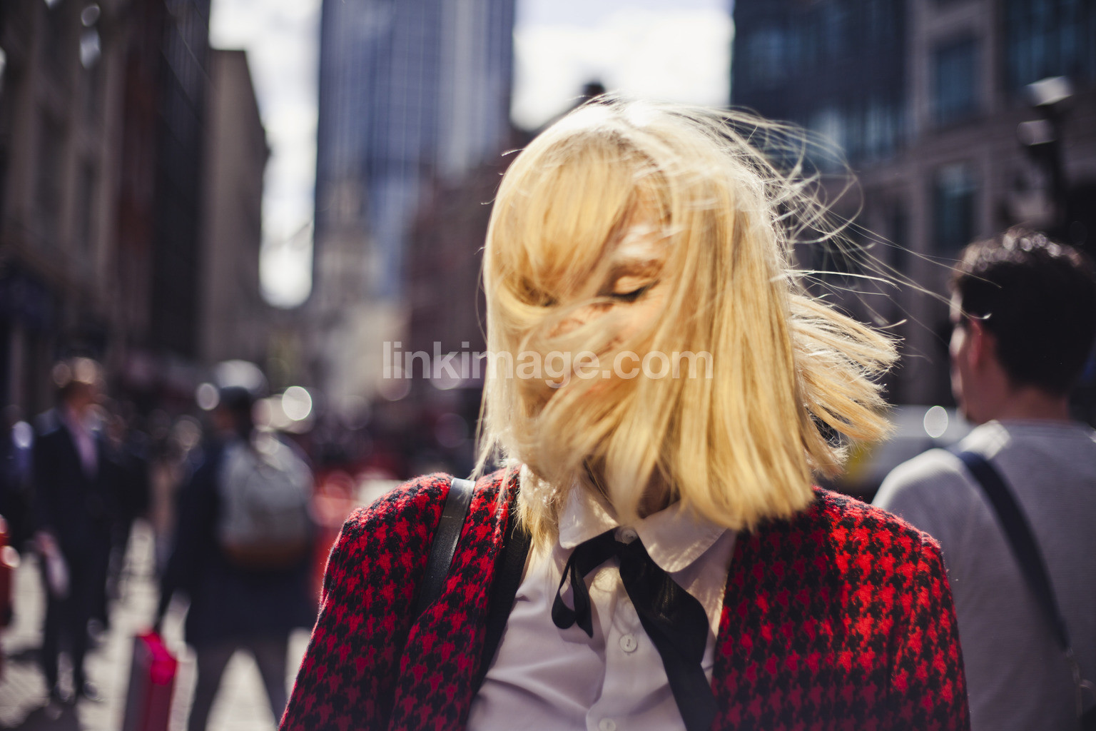 - england, uk, a woman, girl, 25-35 years, street, style, street style, checked, black, red, jacket, urban, blogger, wind, blown, hold your hat, hat, blond woman, speed, on the way, fly, hair, page