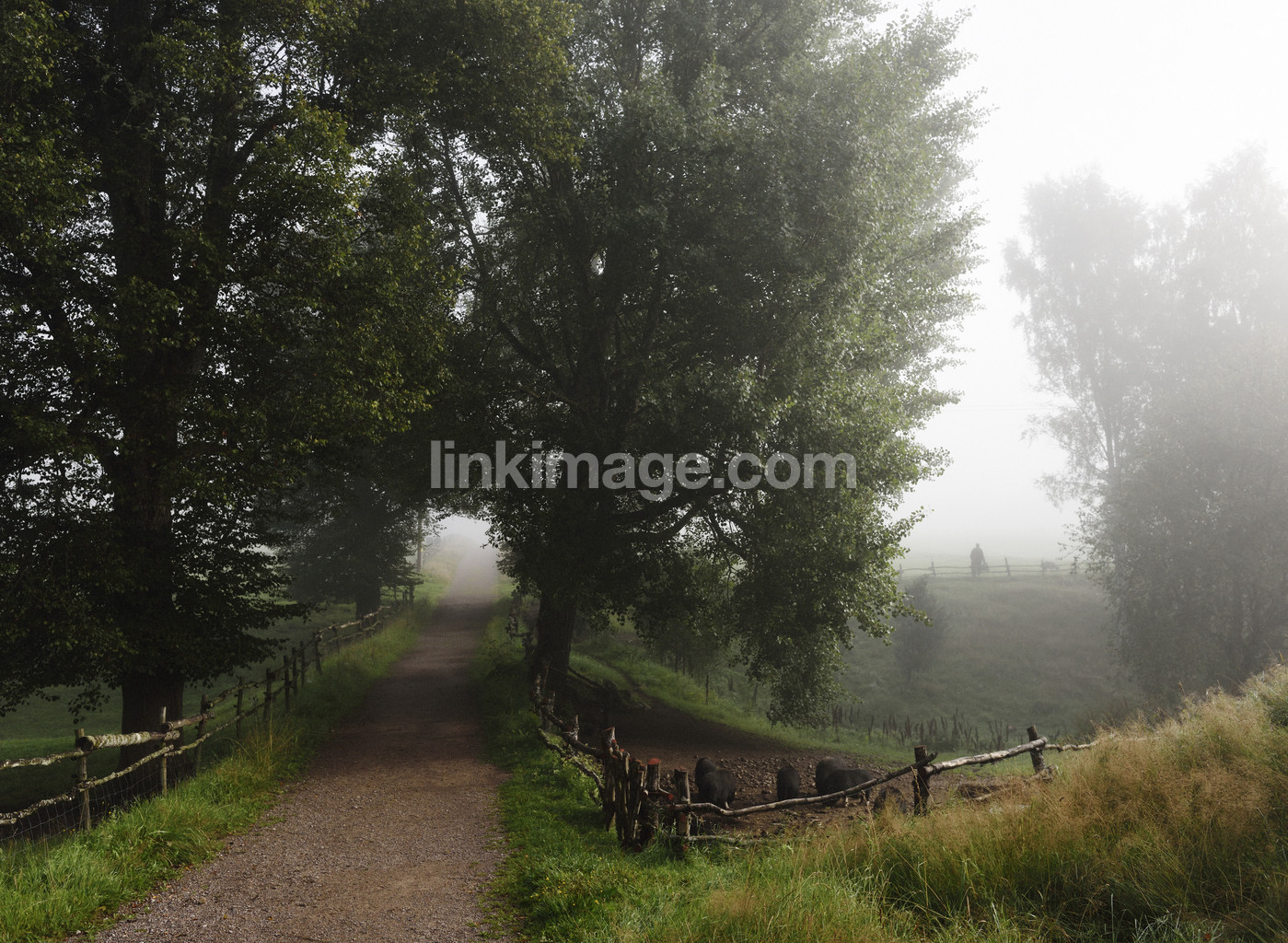 parkway, fog, haze, pig, grass, greenery, pasture, land, landscape, leafy, deciduous, tree, way, gunilla berg