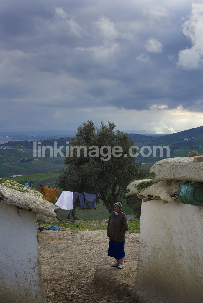 - mountain, village, fez, sky, house, hills, landscape, man, morocco, cloud, north africa, black robe, tree, laundry, clothesline