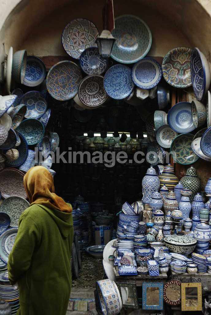 store, fez, glazed, kermik, pots, woman, morocco, mosaic, north africa, mustard, veil, tourism