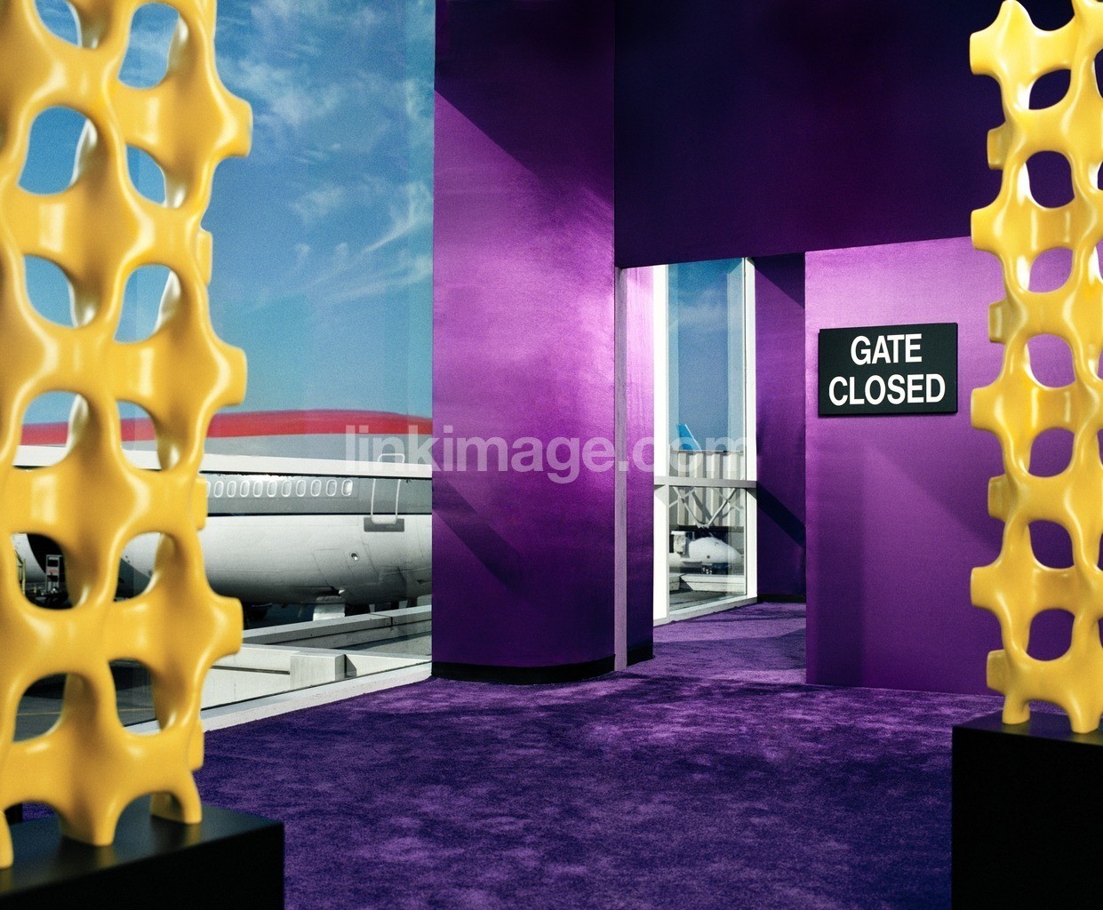 - airport, colure, airplane, bright colors, panoramic windows, purple, yellow