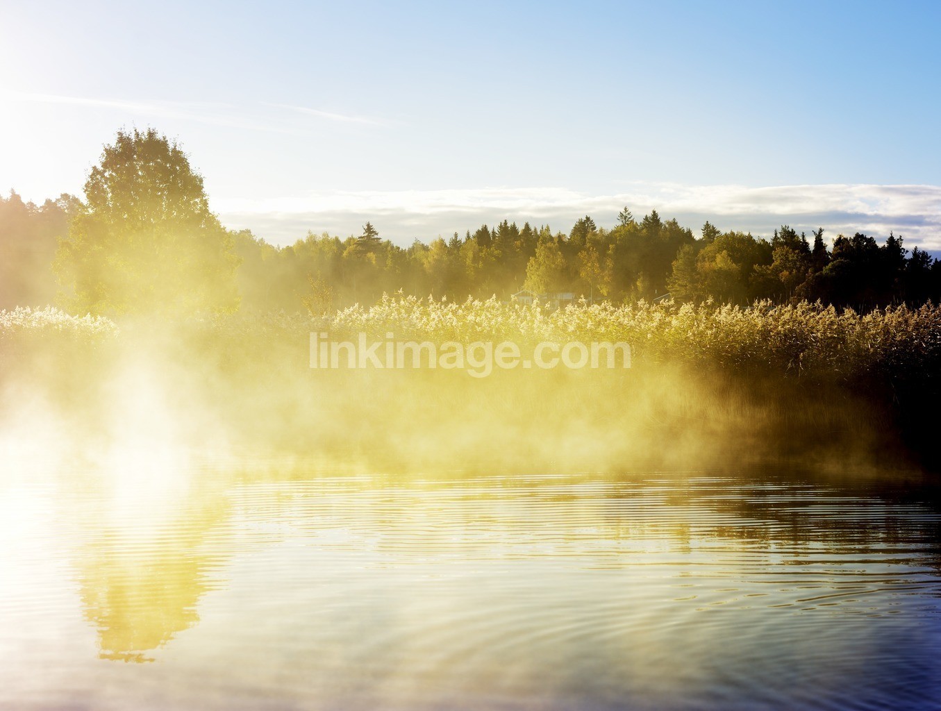 nature, morning, fog, water, sea, sky, reflections, backlight, forest, edge of, mirror