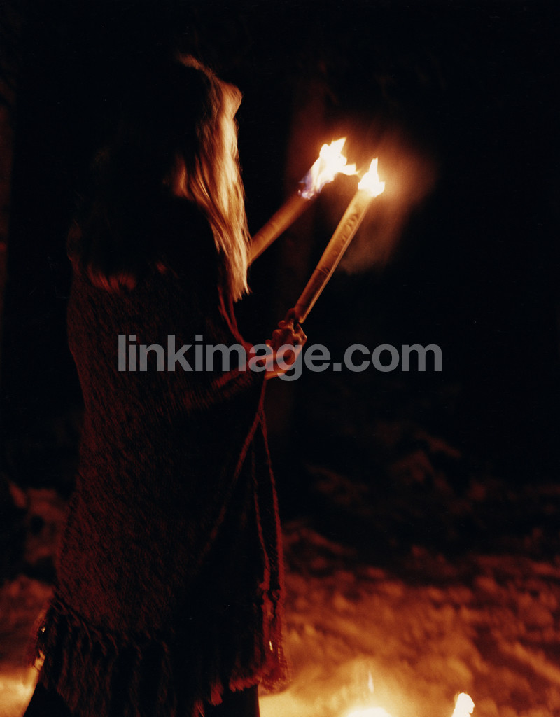 tale, myth, fire, female, girl, torch, night, evening, cool, snow, winter, mood