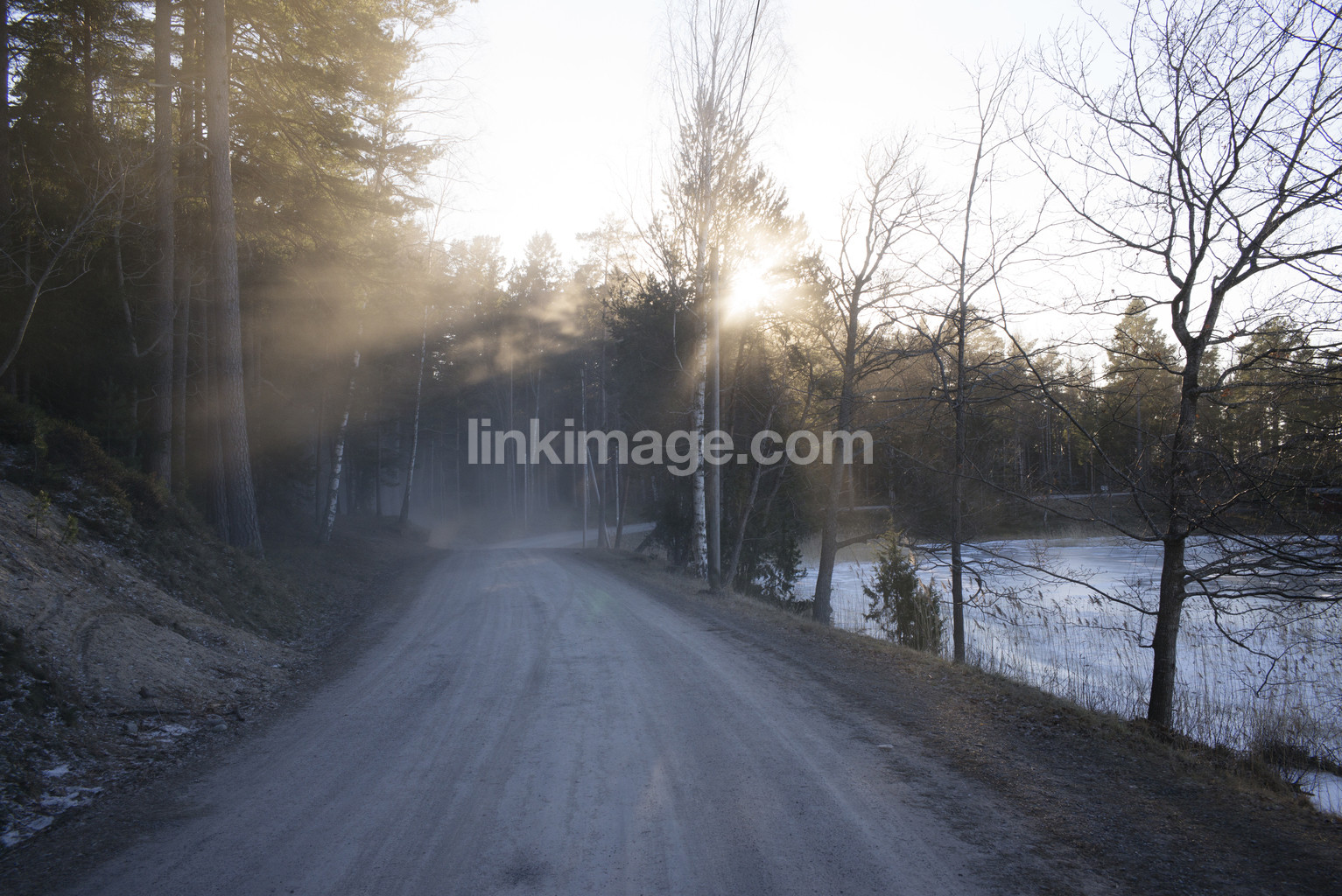 - road fog forest landscape, haze, light reflex reactions, mystery, lake, sunlight, treetops, way