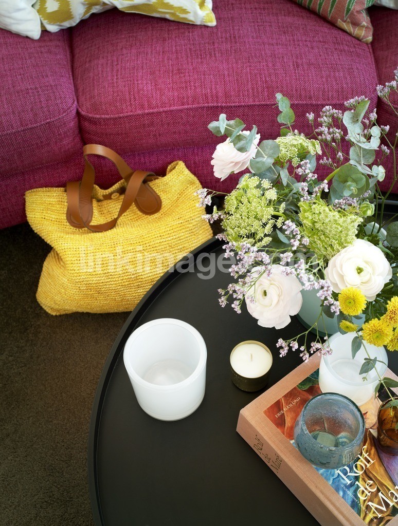 - home, color, furnishings, table, couch, flowers, interior, light, living room, vase, bag
