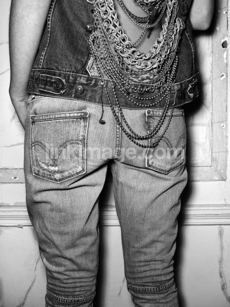 denim, gold, interior, jeans, chain, clothes, woman, fashion, rundown, pose, frayed, style, texture, vintage, wall, west