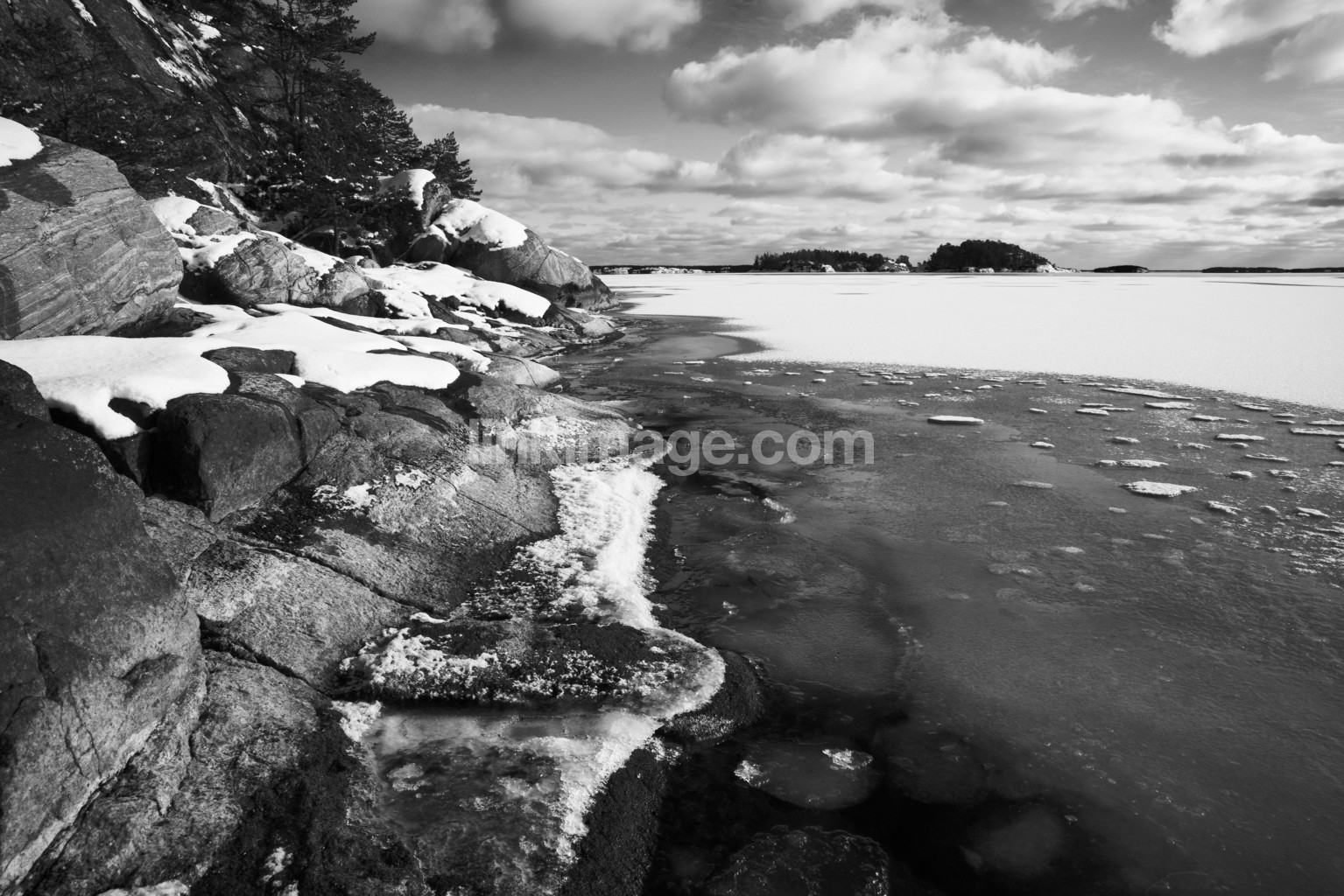 - sea, archipelago, snow, winter, cold, ice, cool, weather, water, nature, clean, sun, sunny, black and white, cliffs, coastal, wild
