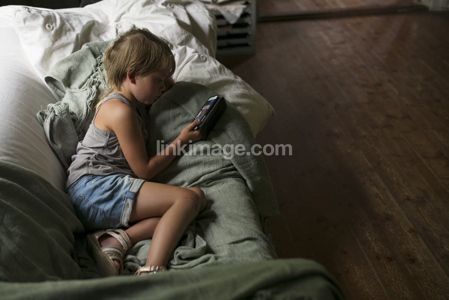 children, alone, girl, in, interior, summer, cottage, is located, reads, pause, game, bed, rest