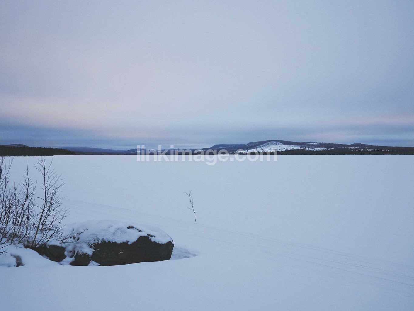 - mountain, winter, arctic circle, snowmobile tracks, ice, lake, frozen, snow, crepuscular, sky, landscape