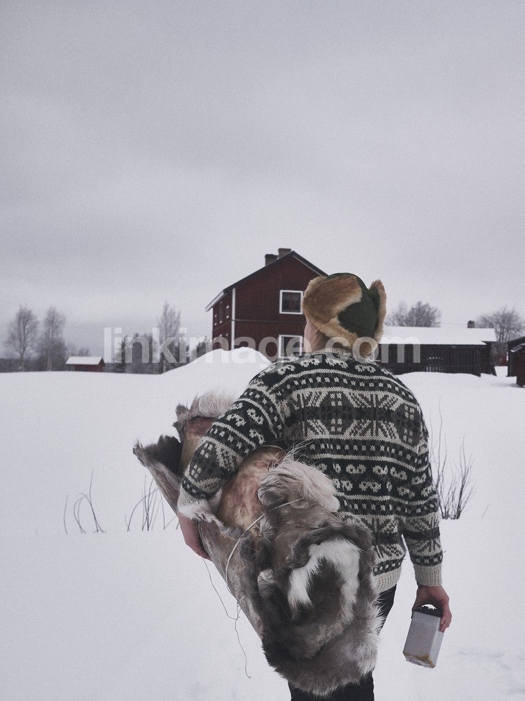 - reindeer, winter, snow, country place, house, cottage, northern, countryside, man