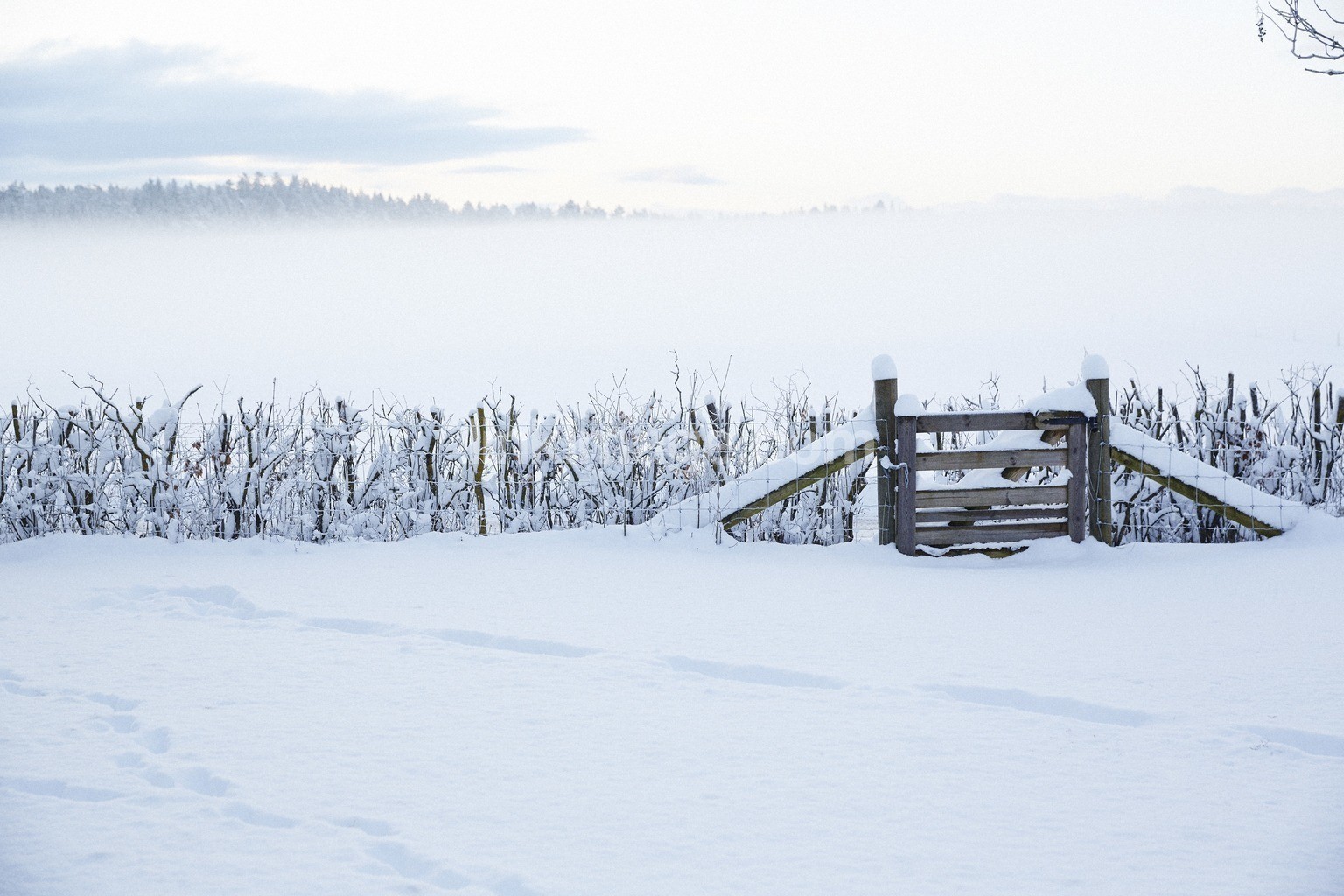 winter, snow, fog, white, garden, pasture, gate, snöspår, nature, landscape, winter landscape, sky
