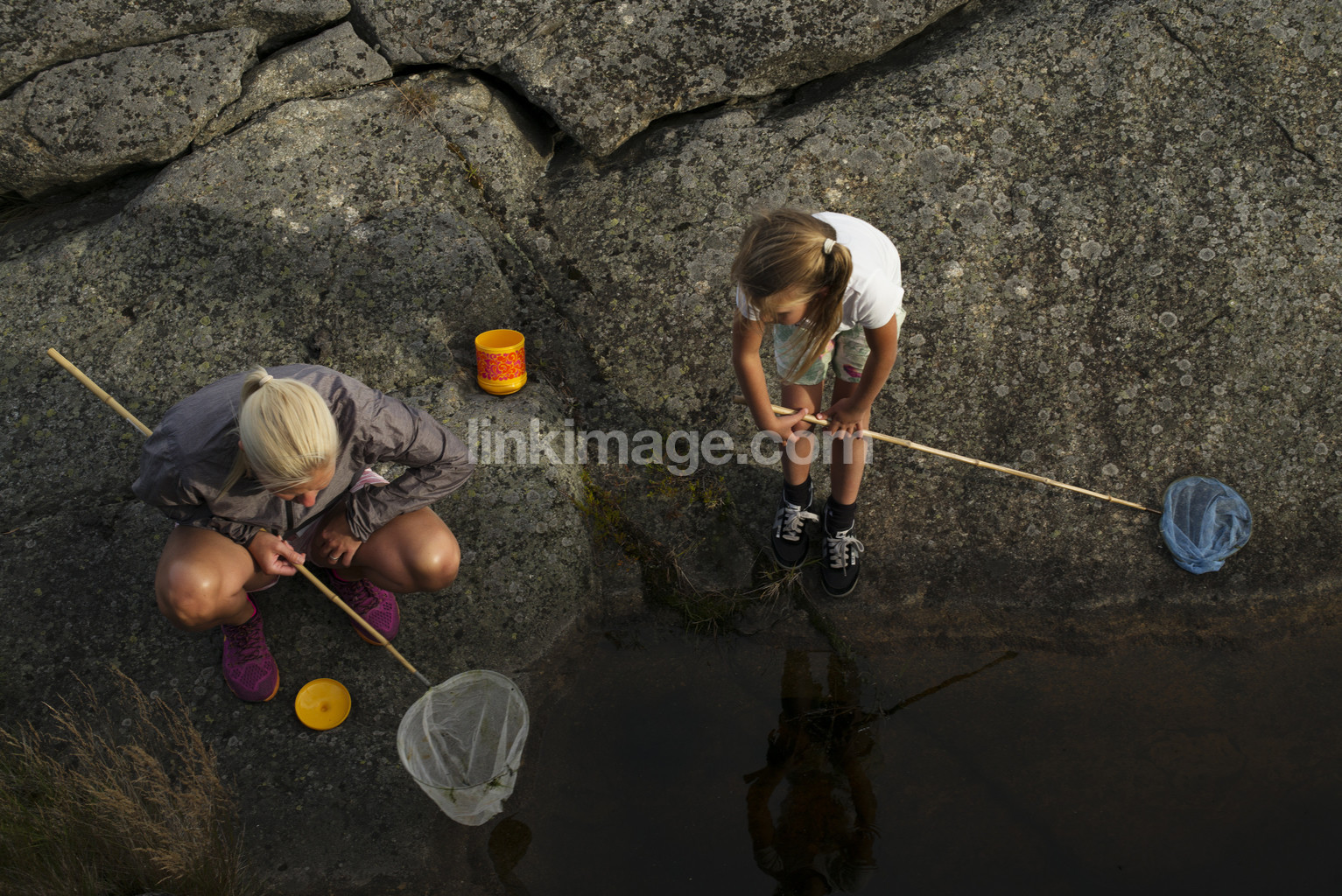 , children, fish, girl, catch, landing net, woman, play, mother, archipelago, summer, discover, water