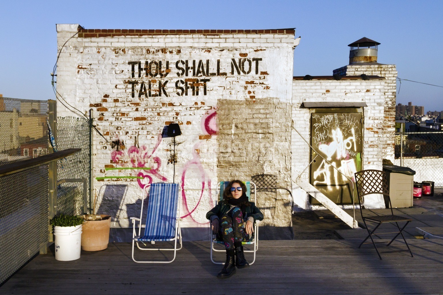 - america, brooklyn, nyc, new york, usa, balcony, message, you should not talk crap, street art, house, woman, quiet, sun, sunglasses, sunlight, lounger, city, ceiling, rest
