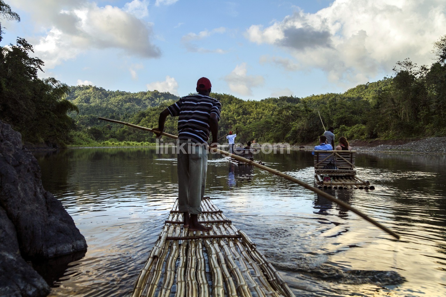 jamaica, jungle, river, raft, man, person, nature, paddle, trip, holiday, summer, transport, tourist, discovery