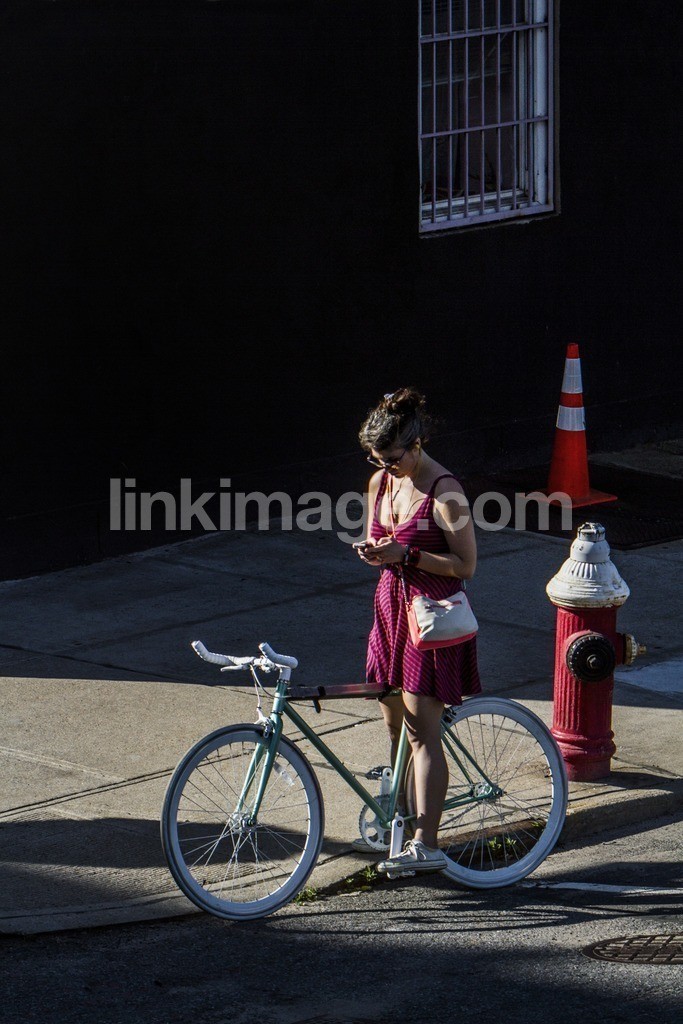 - brooklyn, nyc, new york, usa, bike, cycling, communication, woman, exercise, sms, summer, style, phone, subtitle, girl, living, folk, street, people, city, pavement