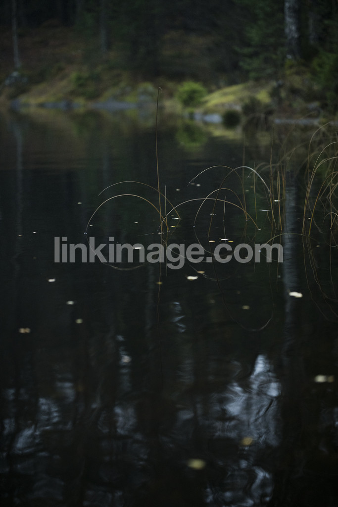 - evening, pattern, reflections, lake, reflection, calm, structures, water, surface, branches, forest, tree