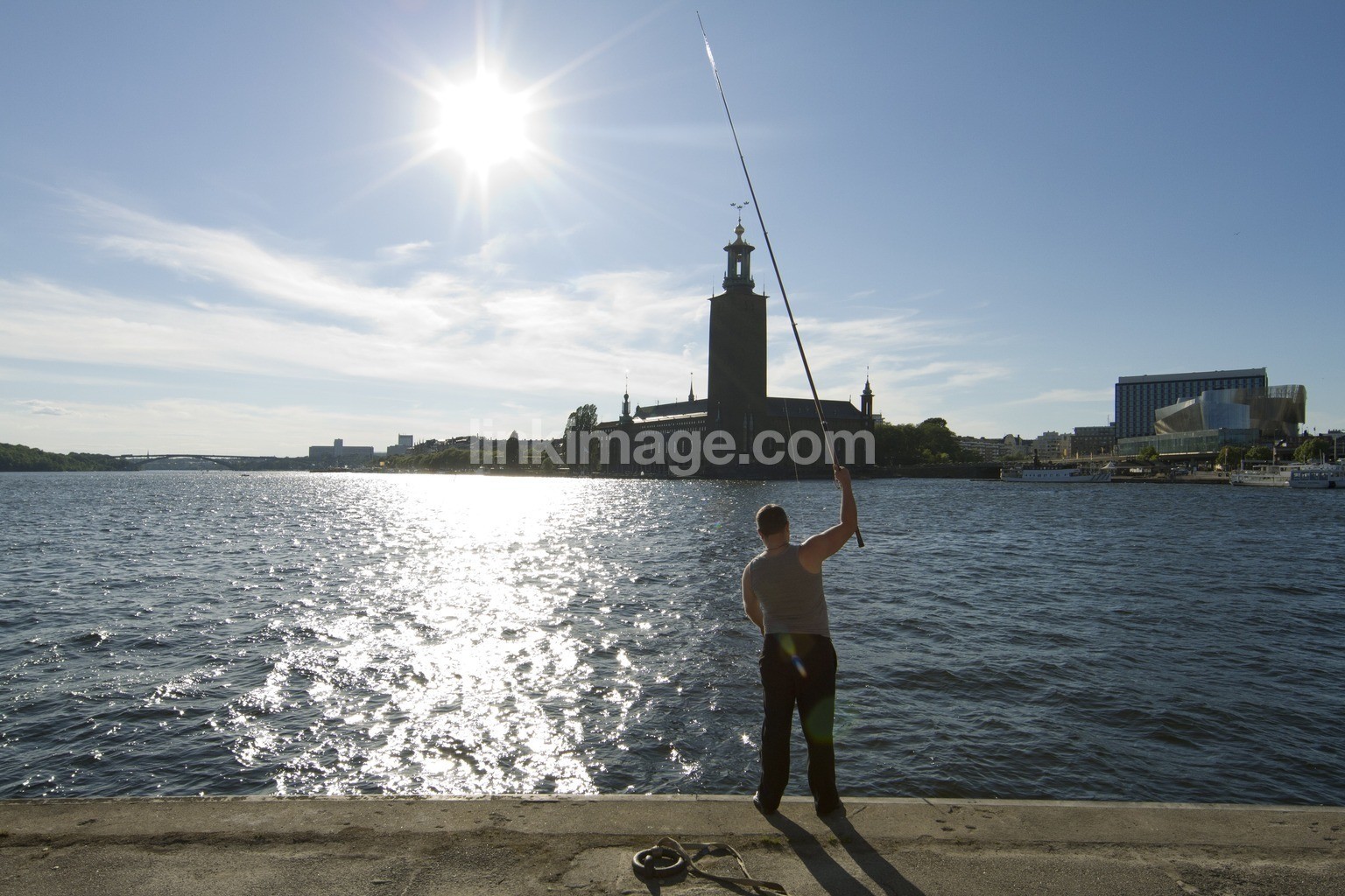 - riddarfjarden, riddarholmen, gbg, stockholm, sweden, building, fish, quay, man, person, trip, holiday, sun, sunbathing, sunlight, summer, city, city hall, three crowns, urban, water