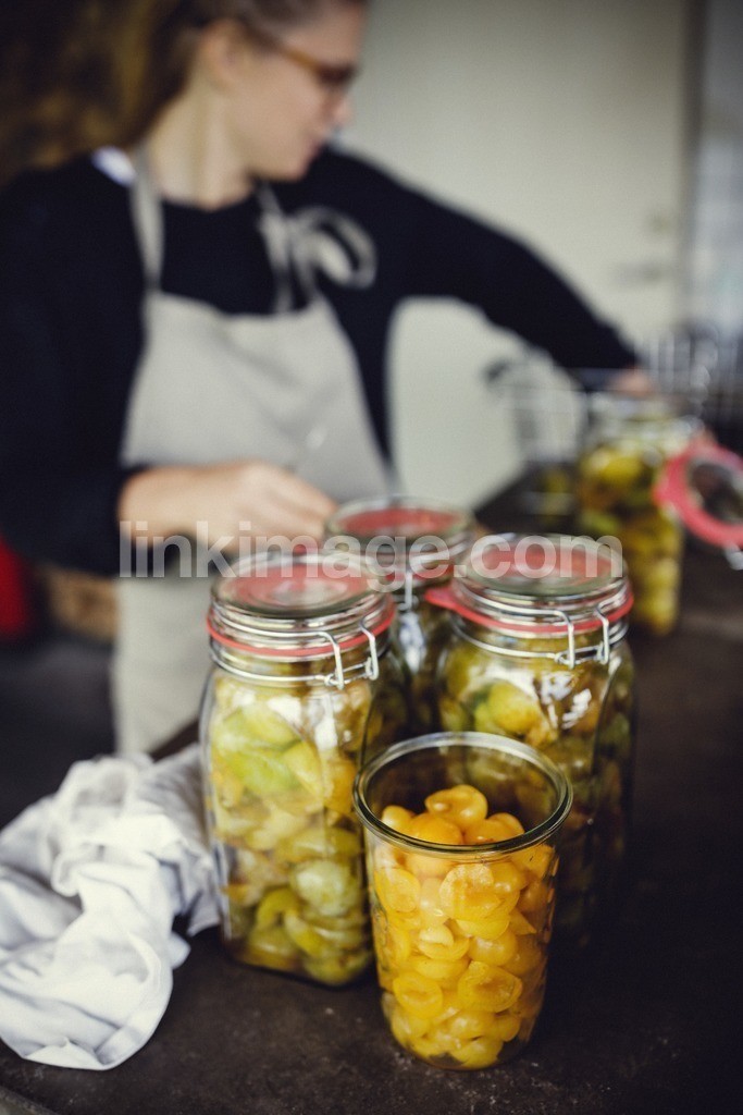 - , cans, fruit, apron, household chore, chef, preservation, woman, kitchen, cooking, plum