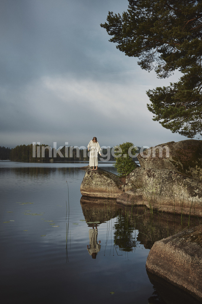 - a woman, girl, 25-35 years, housecoat, morning, sunrise, lake, water, meditation, wake, solar, cloud, early, reflection
