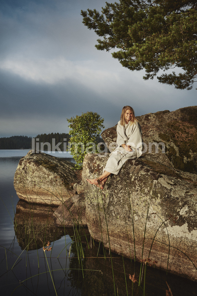 - a woman, girl, 25-35 years, housecoat, morning, sunrise, lake, water, meditation, wake, solar, cloud, early, reflection