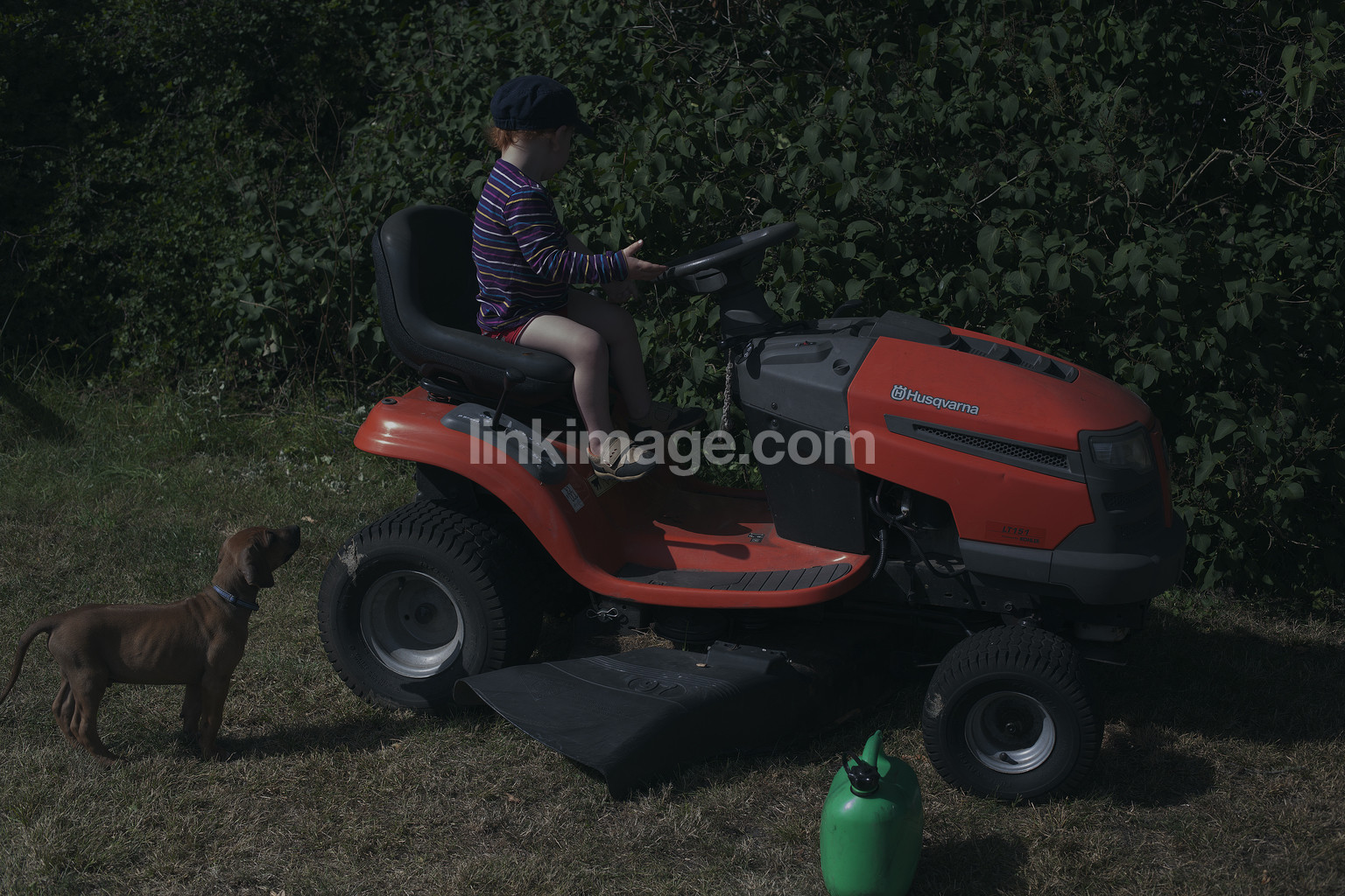- children, lawn mowing, riding lawn mower, the country, garden, summer, puppy, company, friendship