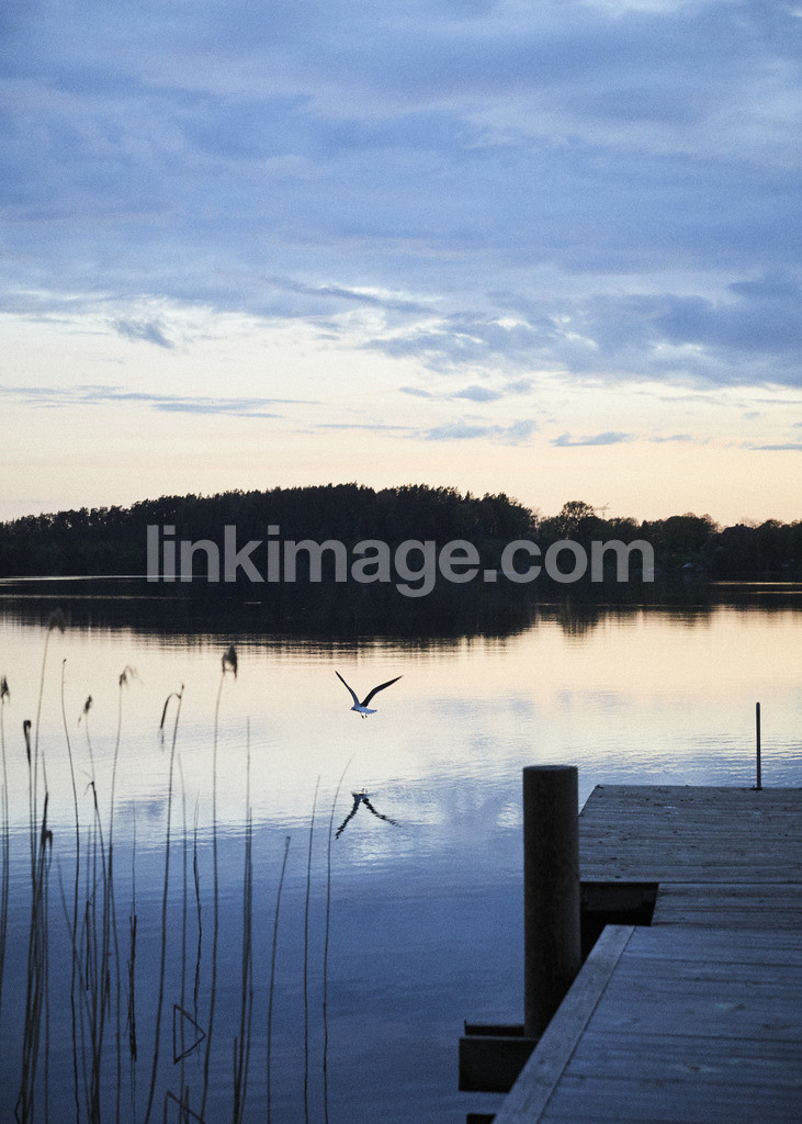 - bridge, bird, flying, seagull, water, summer, lake, evening, dusk, sky, reflection, sharp, evening dip