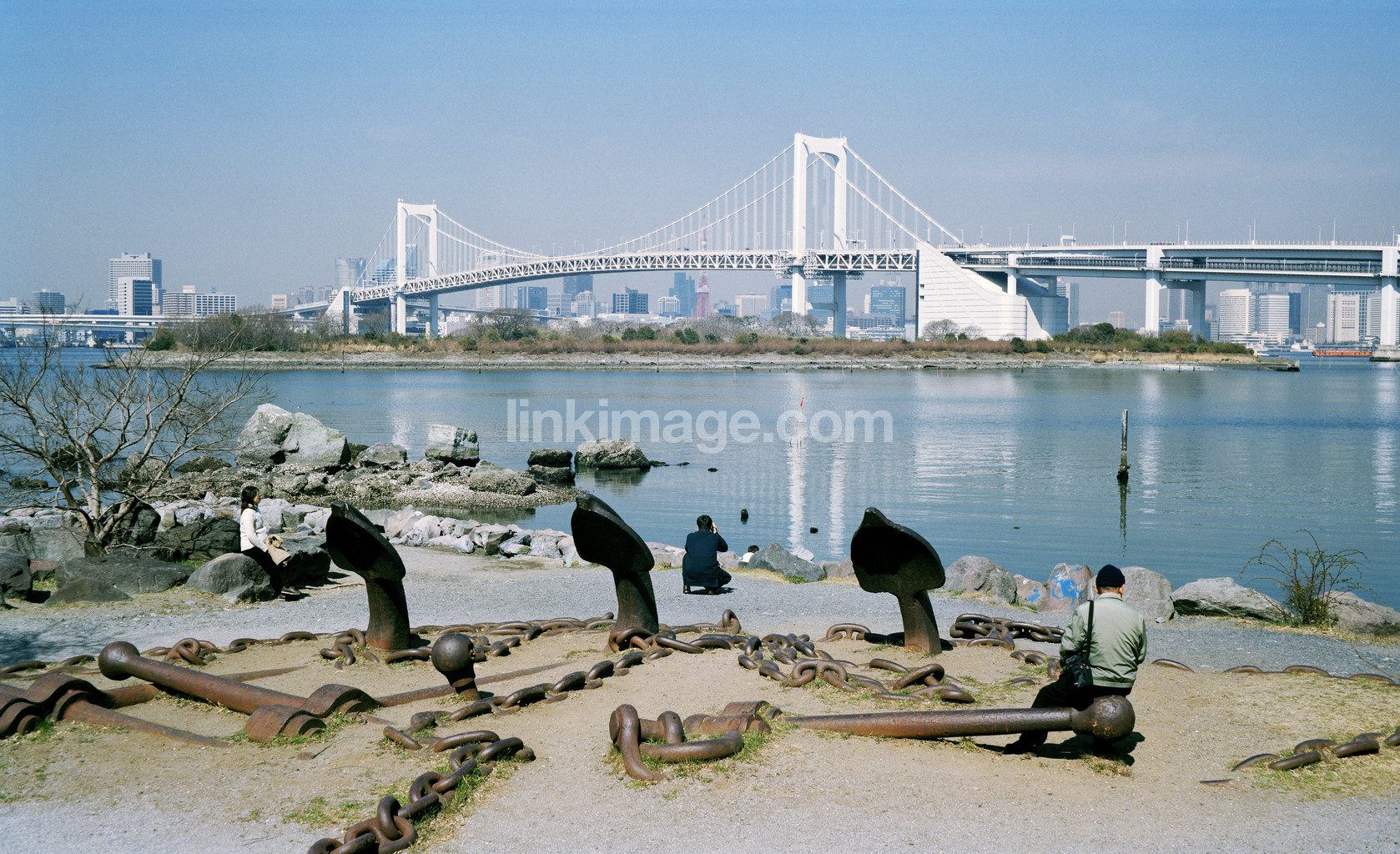 People and anchors on the beach. Tokyo. Japan