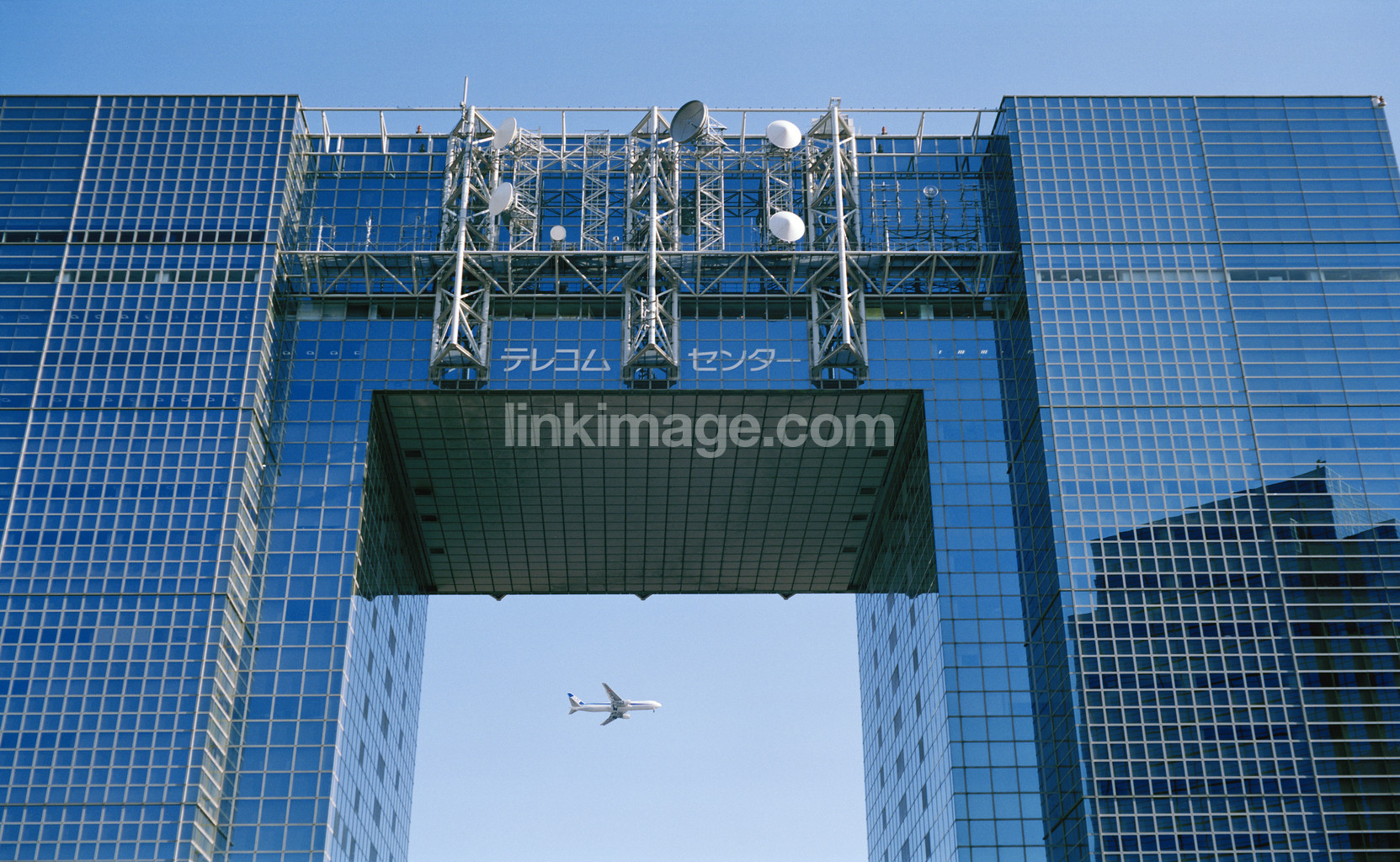 Glass Building and aircraft. Tokyo. Japan