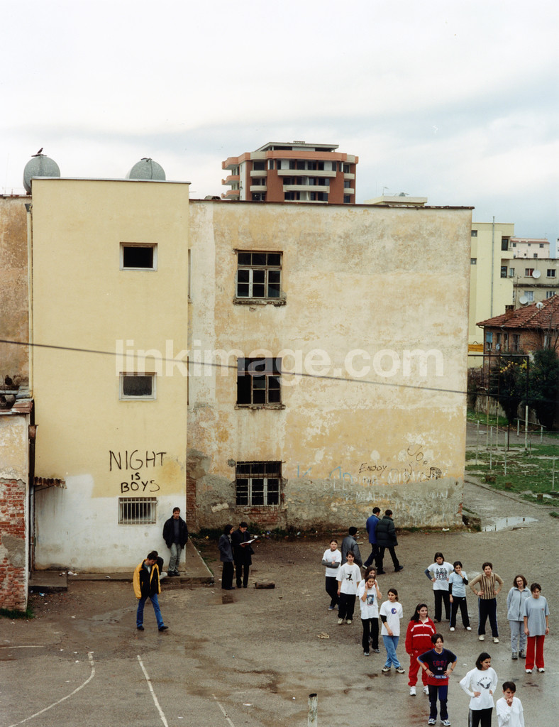 tirana, school, yard, building, city, cloudy, jn064, pupils, point, worn, poor