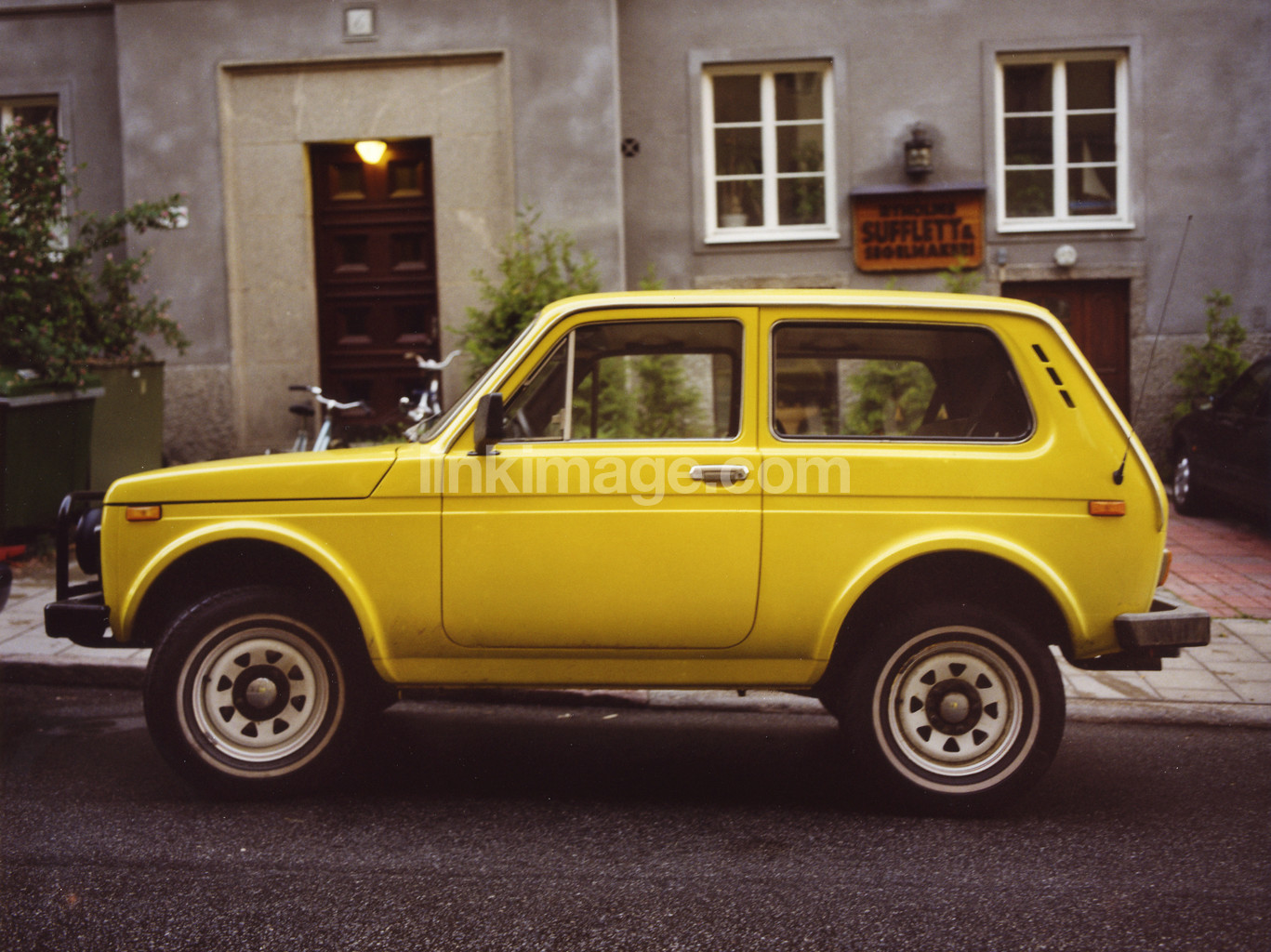 barn, niva, car, yellow, street, block, pavement, vehicle, controller, house, building, city, jn136, parked