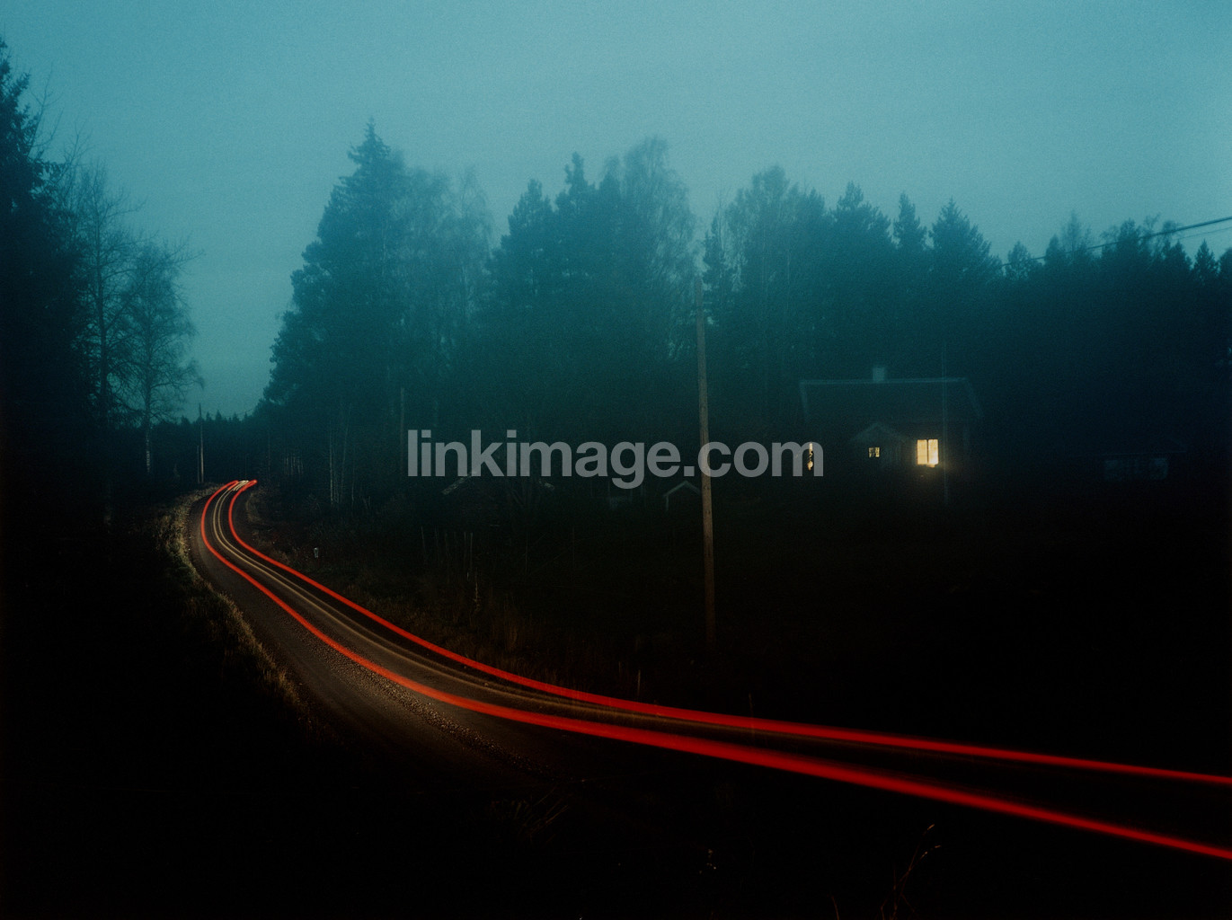 - road, light, car, cottage, house, night, dusk, fog, jw217